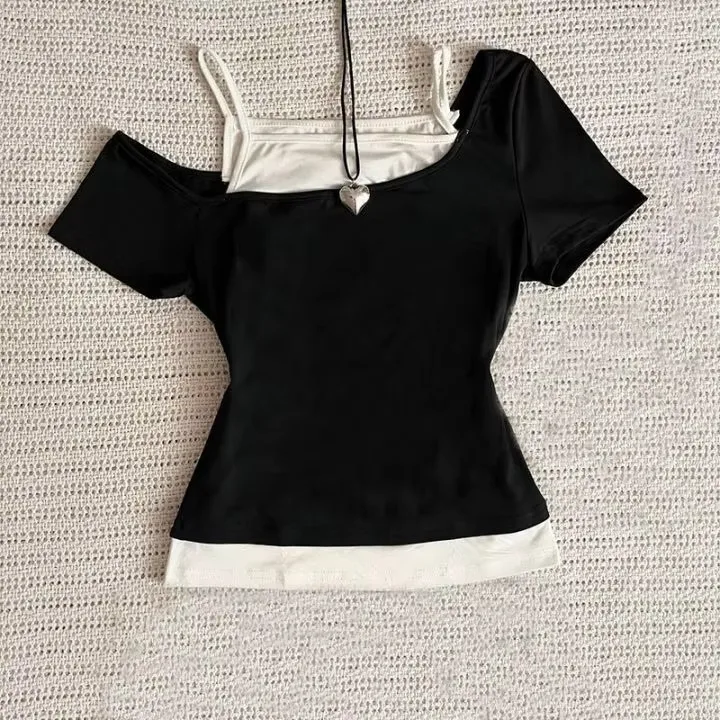 Summer new retro fake two-piece lace up vest, cartoon pattern women's short sleeved T-shirt Y2K letter T-shirt top