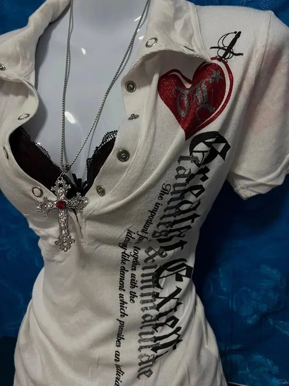 This white short-sleeve tee features a vintage-inspired slim fit with a waist-cinching silhouette that defines your curves effortlessly. Minimal yet powerful, it captures true Y2K streetwear energy made for everyday looks with main-character confidence. A must-have from the new millennium era.